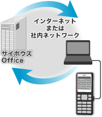 | サイボウズとの通信 | 直接、iモード経由インターネットで接続![]() ※パケットは弊社サーバーを通過いたします。 | サイボウズを利用可能なPCを介して接続![]() |
