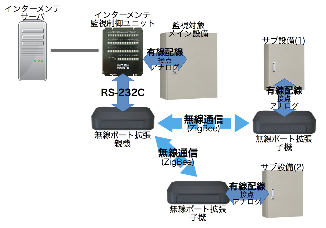 インターメンテ監視制御ユニットに、無線ポート拡張 親機と子機を組み合わせることで、接点入出力ポート、アナログ入力ポートを無線化できます。 |