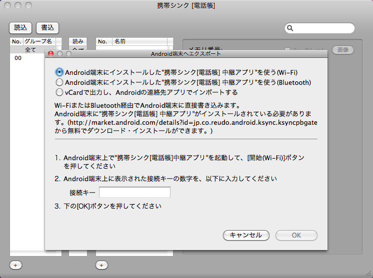 Android携帯電話から Mac 上の 携帯シンク[電話帳] へインポートする機能もありますので、定期的にAndroid携帯電話の電話帳データを Mac にバックアップすることができます。