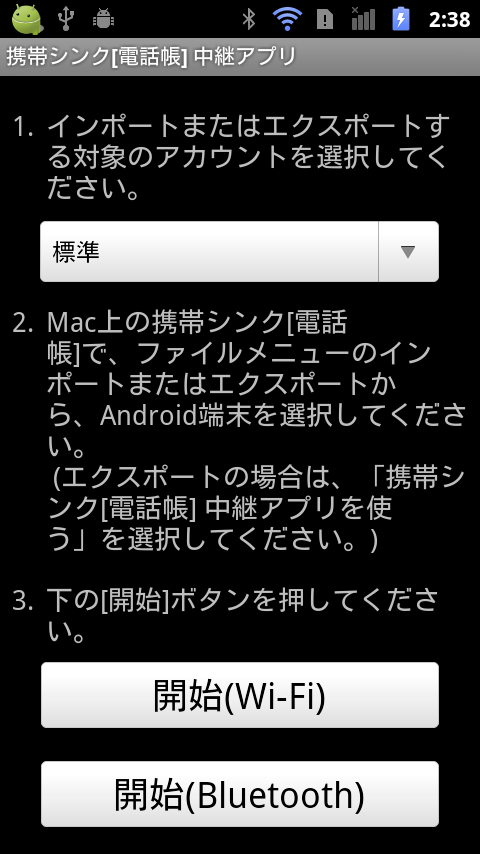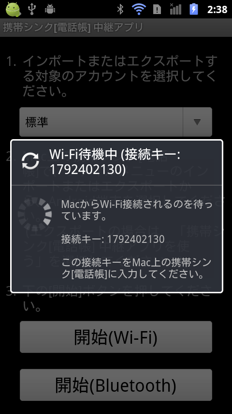 携帯シンク[電話帳] 中継アプリを起動して、[開始(Wi-Fi)] または [開始(Bluetooth)] のボタンを押してください。
